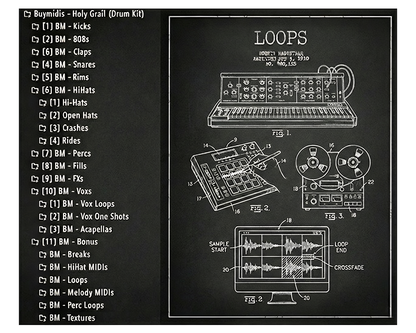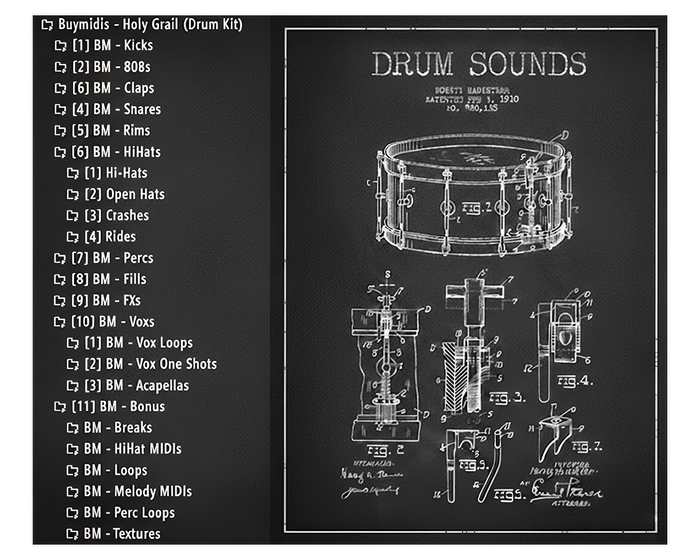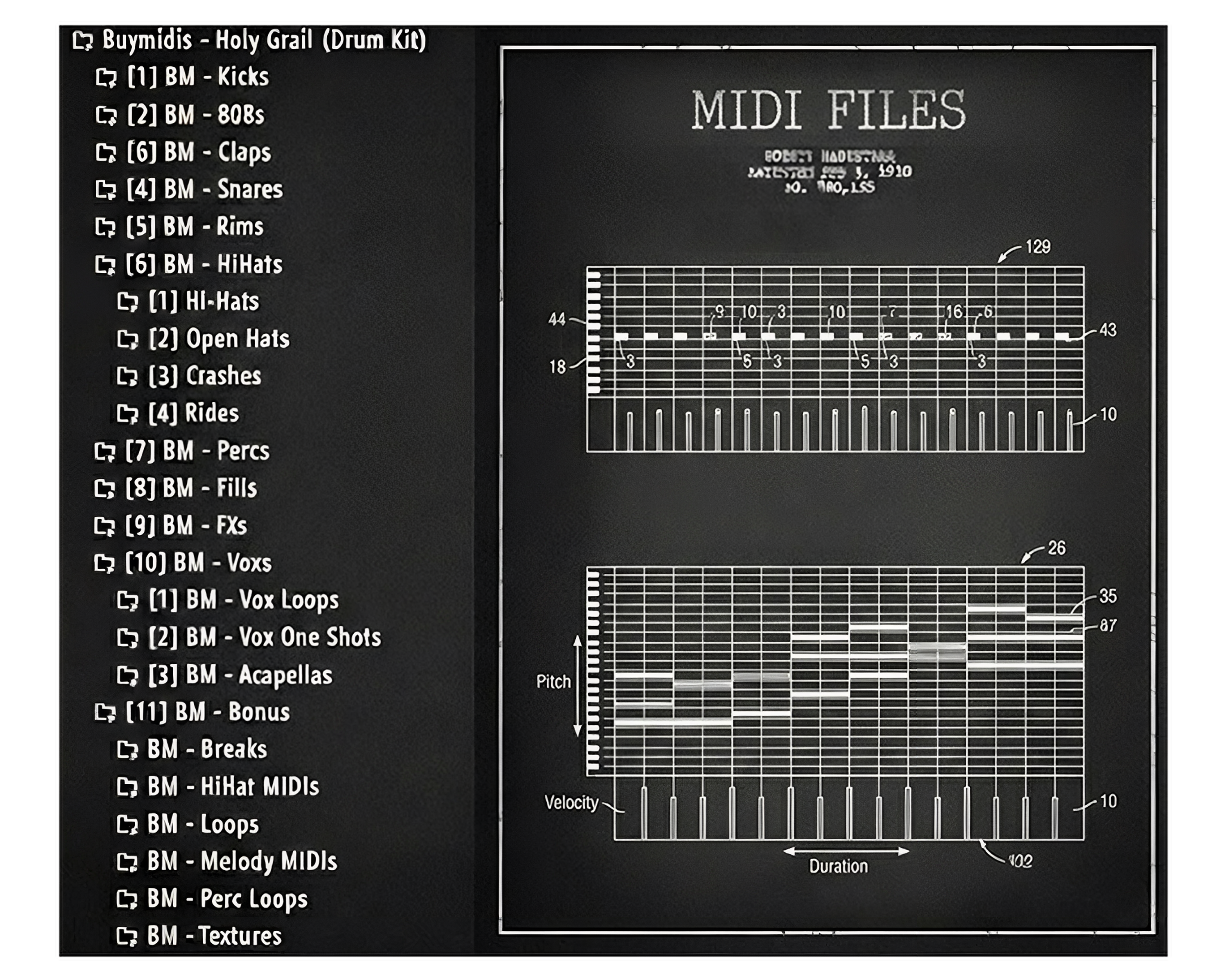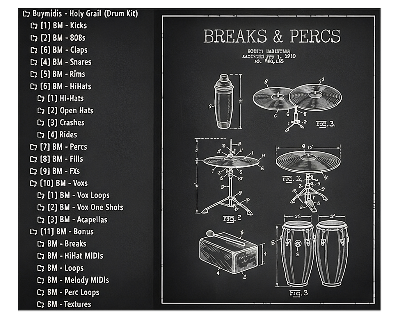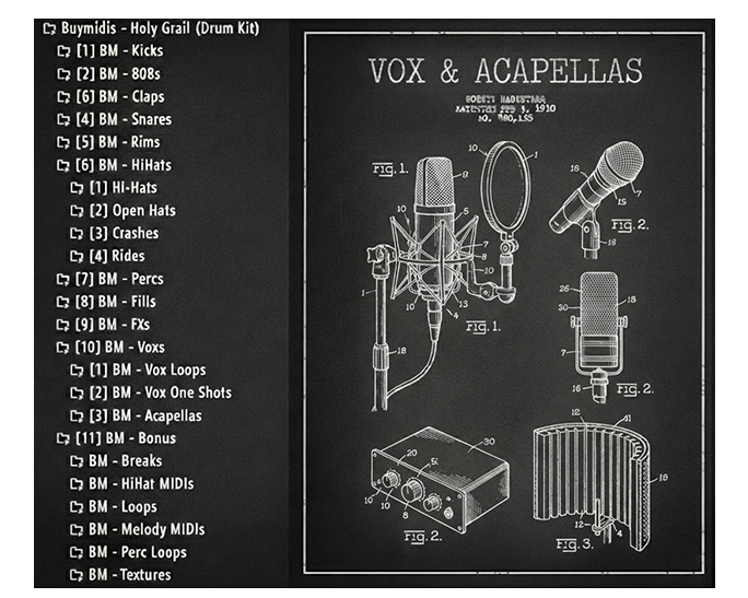 The "HOLY GRAIL" Drum Kit includes a complete, professionally curated collection of mix-ready sounds and creative tools designed to cover every aspect of modern production. Inside, you’ll find essential drum elements such as kicks, 808s, claps, snares, rims, hi-hats, and percussion, along with production enhancers like fills, FX, and original vocal shots & loops.